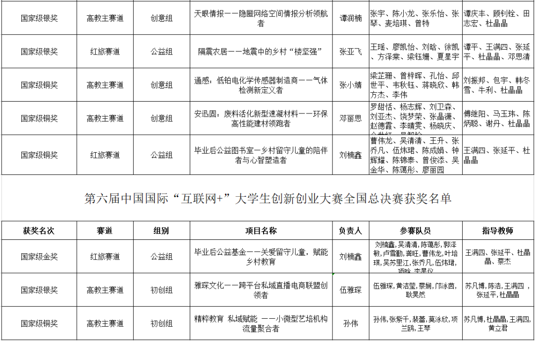 在近三届“互联网+”大赛中,我校共组织参赛项目3000+个,参赛学生10000+人次,获2金6银6铜成绩,连续2年获“青年红色筑梦之旅”活动先进集体奖。我校总成绩位列全省前3,全国前30。