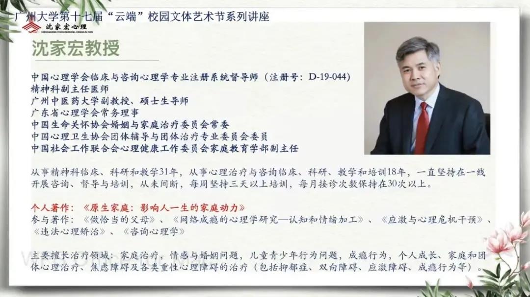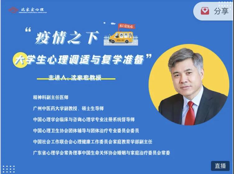 4月26日晚,你我相约的心灵盛宴如期开动,广州大学第十七届“云端”校园文体艺术节系列讲座突破三万人次观看!本次讲座由广州中医药大学副教授,广东省心理学会常务理事沈家宏教授主讲,以“疫情下大学生心理调适与复学准备”为主题。