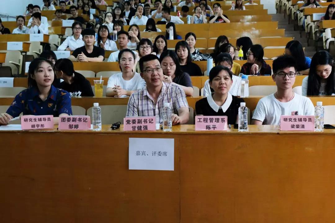 党委副书记甘健强老师、工程管理系陈平老师、助理辅导员胡宇彤老师和助理辅导员梁荣清老师。主持人由黄俊耀、陈绮娴两位同学担任。