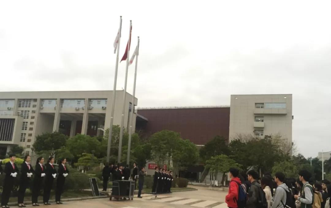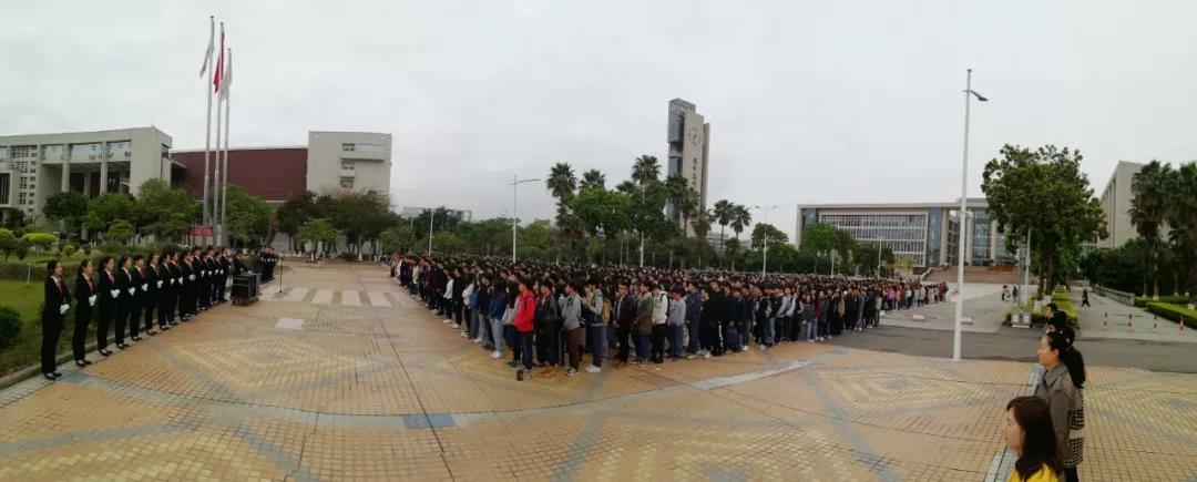 随着各班级整队完毕,升旗仪式正式开始。伴着清风和激昂的国歌声,全体师生肃立,五星红旗在护卫队的守护下缓缓升起,随风而动。国旗升毕,广州大学校歌奏响,我校校旗也升至空中,与五星红旗相映生辉。