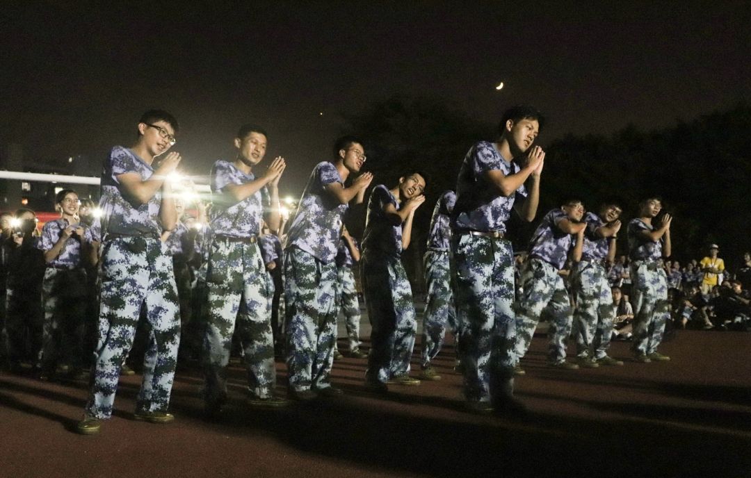 教官整队,同学们迅速回应,动作利索,九天的军训初见成效。同学们训练有素,动作整齐,迅速坐好,安静等待晚会开始。