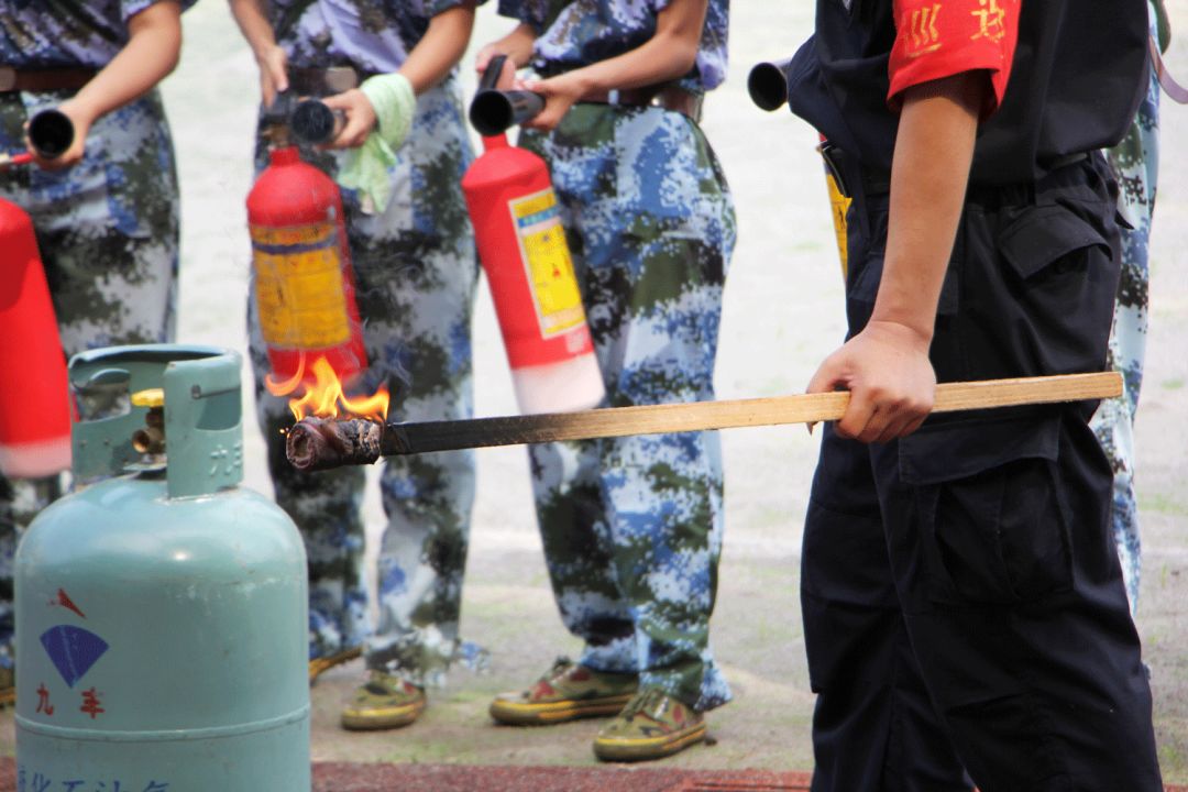 同时,消防员还教给了同学们一个令“火”窒息的操作——窒息灭火法。用一条湿润的大麻布,从侧面覆盖在燃烧物上,令“火”窒息。讲解结束后,教官们便从营中随机抽调几位同学进行窒息灭火法的演练。刚开始,部分同学没能掌握好窒息灭火法的技巧,没有顺利灭火,但在教官以及消防人员的耐心教导下,同学们逐渐掌握了技巧,顺利灭掉火焰。现场响起热烈掌声,为掌握了灭火技巧的同学予以赞扬与庆贺。