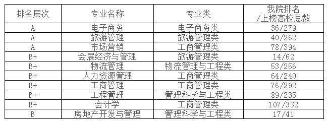 其中,电子商务专业、旅游管理专业、工商管理专业(市场营销)综合排名为A;旅游管理专业(会展经济与管理)、物流管理专业、工商管理专业(人力资源管理)、工商管理专业(工商管理)、工程管理、会计学专业综合排名为B+;工程管理专业(房地产开发与管理)综合排名为B。