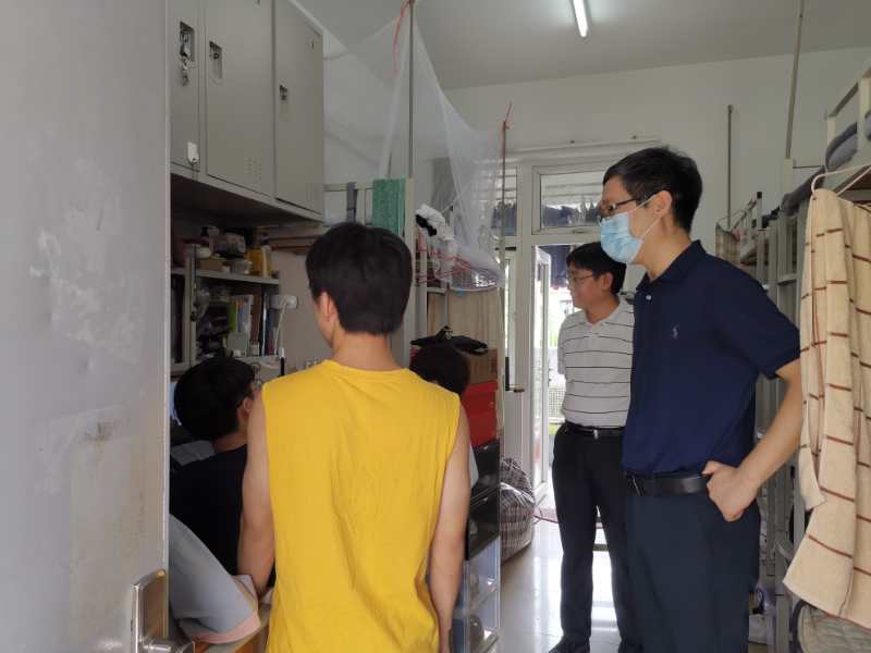 在研究生宿舍中,薛院长及王院长了解同学们的学习研究情况,鼓励他们保持勤学慎思,多和自己的导师沟通,不断学习进取;在17级学生宿舍中,班主任在和学生聊天的过程中,发现学生对实习等问题存在疑惑,李书记和陈院长马上现场了解情况,并表示会及时帮他们解决;在19级学生宿舍,老师们细心地了解刚从桂花岗搬到大学城的同学们的适应情况,并提醒他们整理好宿舍卫生,注意个人防护,调整好状态,尽快适应新校区的学习和生活。
