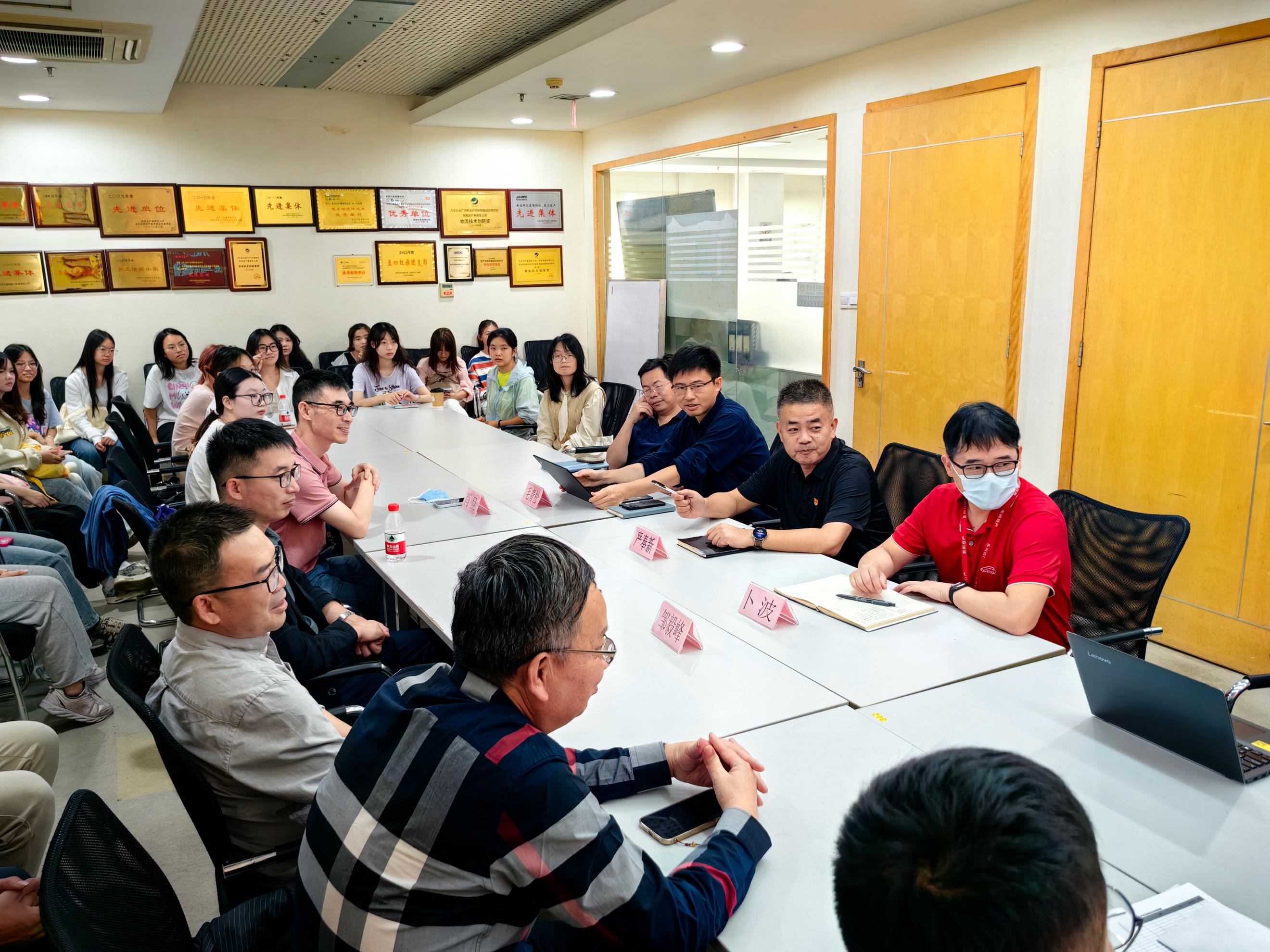 紧接着,师生们到达东风物流集团,由东风物流集团技术发展部物流技术室一罗春龙经理介绍了东风物流集团及物流技术领域的情况,并邀请了东风物流集团工作的广州大学优秀毕业生,东风物流备件物流事业部综合管理室纪淼鑫经理分享自己的学习工作经验。在罗春龙经理集团技术发展部物流技术室陈超主任的引领下,参观人员来到了东风物流的物流技术实验室,通过罗经理与陈主任的讲解,我们了解到智能物流实验室中重要攻关课题的巧妙设计,认识到智慧物流在自动化物流中的创新型发展。