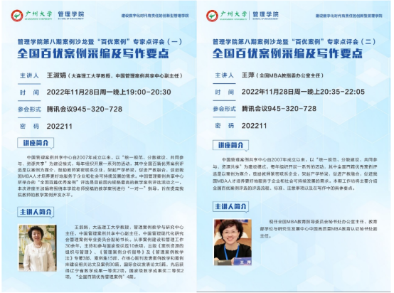 邀请到全国MBA教指委办公室主任王萍及中国管理案例共享中心副主任王淑娟为学院的教师开展题为“全国百优案例采编及写作要点”的讲座。讲座主要分为两大议程:一是主题分享,由两位专家分享了全国百优案例的评审规则及采编和写作要点;二是案例点评,由学院周翔、李惠娟、李旎、冉佳森和罗顺均5位老师分享自主开发的教学案例,并由专家进行一对一的深度点评。本次案例沙龙开启了一种全新的沙龙形式——专家深度点评。与会教师通过聆听专家对其他老师的案例点评,对教学案例开发有了更加深刻的理解。