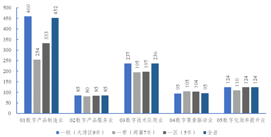 报告首次尝试构建测算了广东省数字经济创新指数(图1),经研究发现,广东省数字经济创新活动主要集中在数字产品制造业和数字技术应用业;数字产品制造业是目前广东省数字经济创新水平最高和企业最集中的产业。珠三角核心区(大湾区9市)整体创新水平居于全省前列,北部生态区5市(除数字要素驱动业外)整体创新水平高于沿海经济带东西两翼7市。全省来看,除了数字产品制造业各地区创新水平差异较大和大湾区9市在数字技术应用业领先较多以外,各地市在数字化效率提升业、数字要素驱动业和数字产品服务业领域的整体创新水平差异不明显。