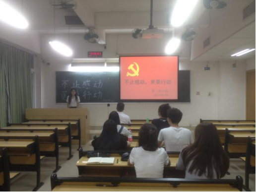 接下来是四位师兄师姐的分享时间,首先是李展旺师兄给大家分享了一下他在大学四年如何规划自身的时间,在学习、参加平时的一些比赛,又或者在寻找工作上给出了一些建议,在考研方面,师兄更是给出了几点例如提高绩点、学术研究有所成果等建议。更重要的是在发挥党员先进性上,师兄谈到自身的入党动机以及入党以后的感悟,谈到了入党之后受到党支部一些作为优秀党员的师兄师姐的影响如何努力向党支部靠拢的经历。接着王小强同志进行分享,小强师兄将自己的大学四年划分为认识探索阶段、清楚路线阶段、成熟阶段和收获四个阶段,在最后师兄给师弟师妹们给出了几点建议,其中师兄谈到在大学起码要做一件引以为傲的事情,而师兄最引以为傲的就是加入了中国共产党,加入了学四支部。最后给予了师弟师妹创造自己精彩大学生活的美好祝愿。第三个分享的是刘照辉师兄,照辉师兄谈到了在大学学会的做人、做事,分享了自己在校青协时为人们做奉献的经历,他认为我们年轻人就是中国的未来,应该抱有一种“我为人人、人人为我”的心态去做事。最后是由包舒婷师姐进行分享,包舒婷师姐分享的有关党性、信仰方面的经历,从目前热播的电视剧《人民的名义》作为切入点,讲到里面角色陈岩石作为一代老党员的缩影,他的所作所为让我们感动。谈到了我们作为一名党员或者说想作为一名党员,不应该用一些成绩、称号去评价,而是用不断追求进步来评价一名党员。