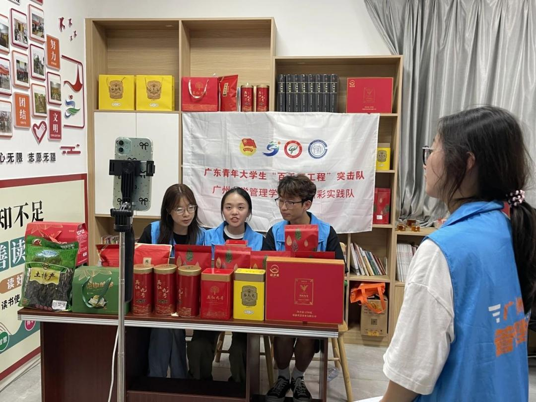 电商助农板块,实践团走进了红旗茶厂、白鹿乡农业公司和英德市浛洸镇乡村振兴带货直播间,实践团师生与英慧茶叶有限公司合作,以“白云深处藏古韵,绿水青山出好茶”为主题,在小红书平台开展带货直播。