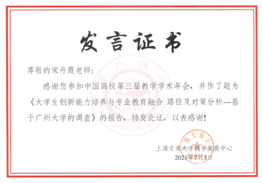 创新与战略系宋丹霞老师所撰写的教学研究论文曾获广州大学第二届教学学术论文优秀奖,受学校教师发展与教学评估中心推荐,向年会投稿。此次,宋丹霞老师共投稿两篇论文,其中《大学生创新能力培养与专业教育融合路径及对策分析---基于广州大学的调查》受邀参加会议分会场汇报研讨,另一篇《行动学习对大学生创新能力构建机制研究---以《创新创业实训》课程为例》也受邀参加海报分享。