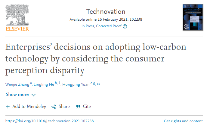 袁红平教授发表了题为“Enterprises’ decisions on adopting low-carbon technology by considering the consumer perception disparity”(考虑消费者感知差异的企业低碳技术采纳决策研究)的研究成果。该论文发表于管理科学领域国际期刊《Technovation》,该期刊为SSCI和SCI双检索,最新影响因子为5.729,在运作和管理科学(Operational Research & Management Science)领域中排名第1/83,在工程与工业(Engineering, Industrial)领域中排名第3/84,是JCR一区和中国科学院一区期刊,ABS三星级期刊,FMS管理科学高质量国际期刊列表B级期刊。论文第一作者为广西民族大学经济学院张文杰博士,袁红平教授为本文通讯作者,合作者还有西南交通大学经济性爱网
