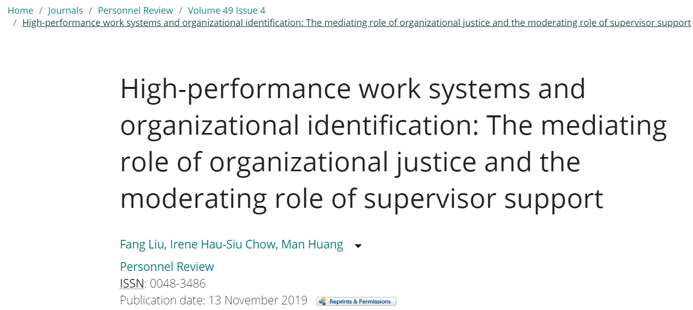 刘芳副教授(第一作者)、黄曼博士(通讯作者)与香港恒生大学周巧笑教授的合作研究成果《High-performance work systems and organizational identification: The mediating role of organizational justice and the moderating role of supervisor support》,于2020年04月在人力资源领域的期刊《Personnel Review》第49卷第4期(939页至955页)正式发表。《Personnel Review》是JCR劳动学科(Industrial Relations & Labor)二区SSCI期刊。