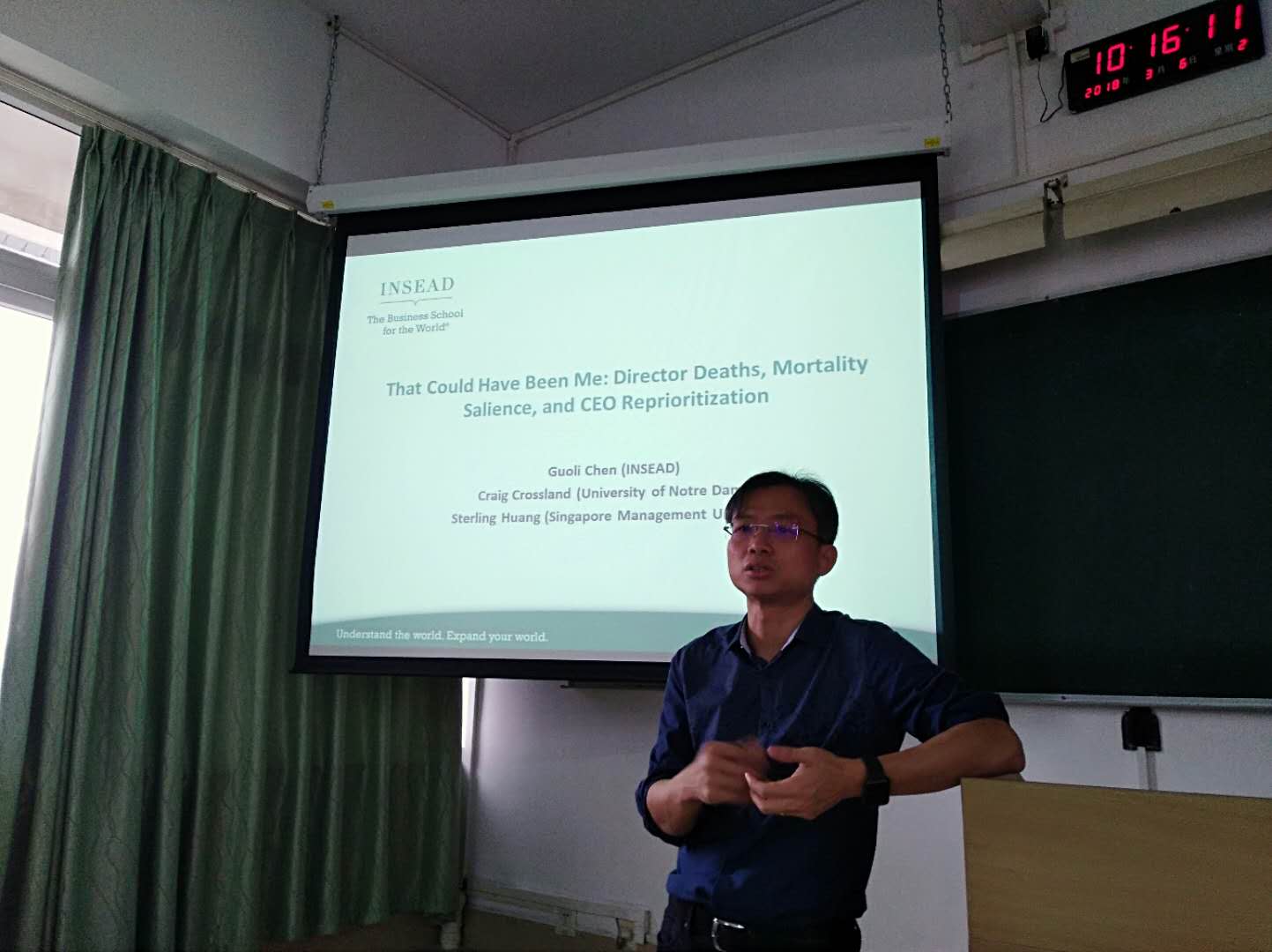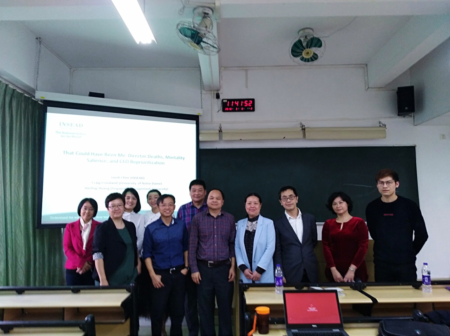 ,作题为 “That Could Have Been Me: Director Deaths, Mortality Salience, and CEO Reprioritization”的讲座。陈教授介绍了他们的一个最新的研究,他和合作者发现曾经历过公司里董事死亡事件的CEO更有可能采取做出趋于社会性的决策,比如增加非营利组织的董事,更多使用社会性的语言,和在本公司和自己任职董事的其他地方履行更多的社会责任。同时,他们还发现当死亡事件越激烈(如去世的董事和CEO相似性越高,是突然去世)的情况下,这种影响会更加激烈。陈国立教授的扎实学术功底,幽默的演讲风格给参与讲座的师生留下了深刻的印象。性爱网